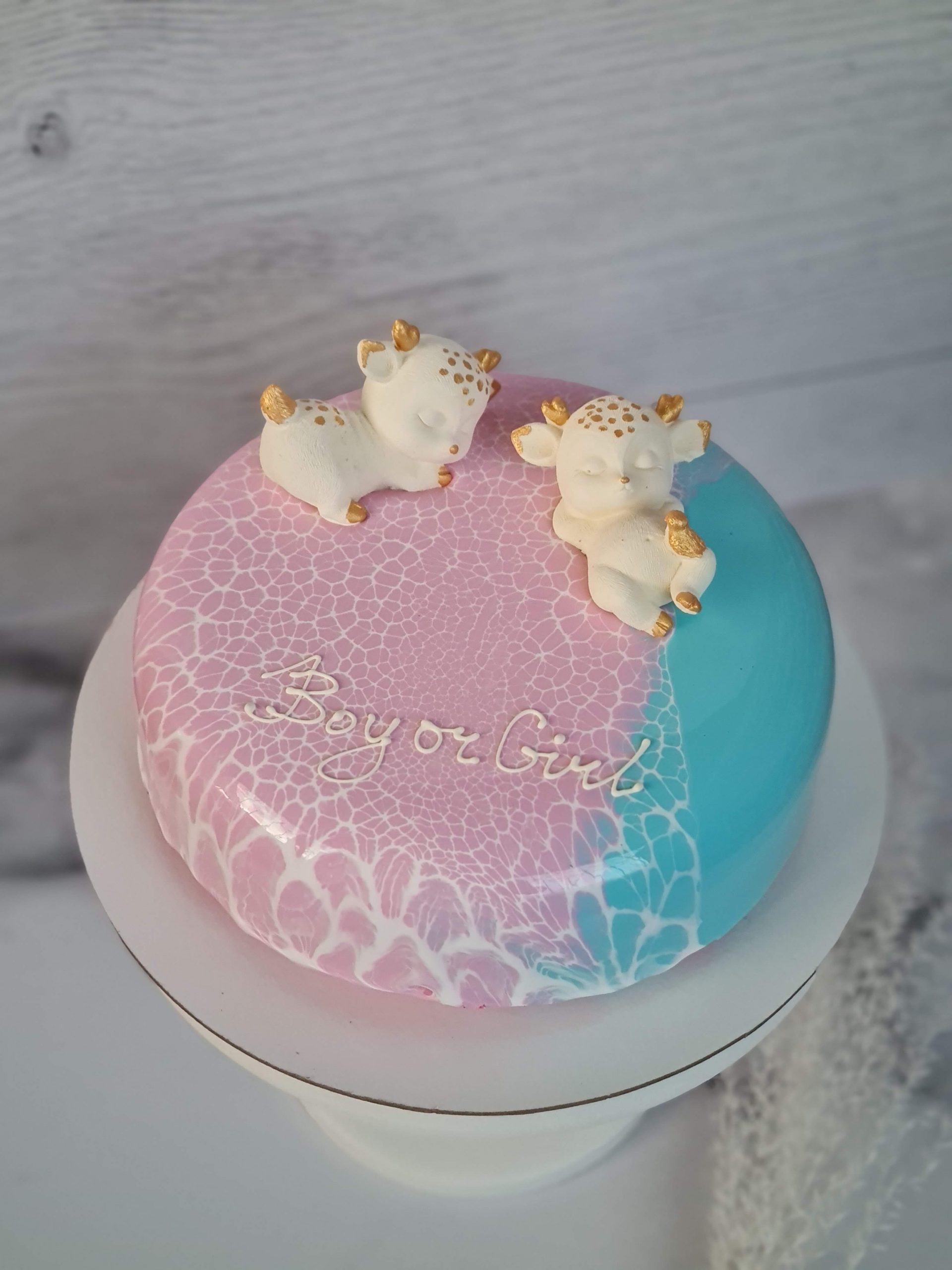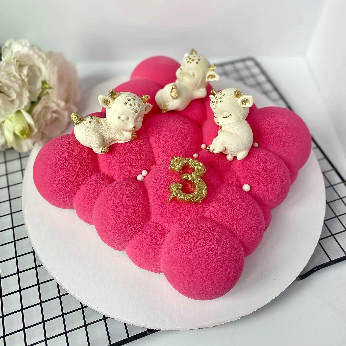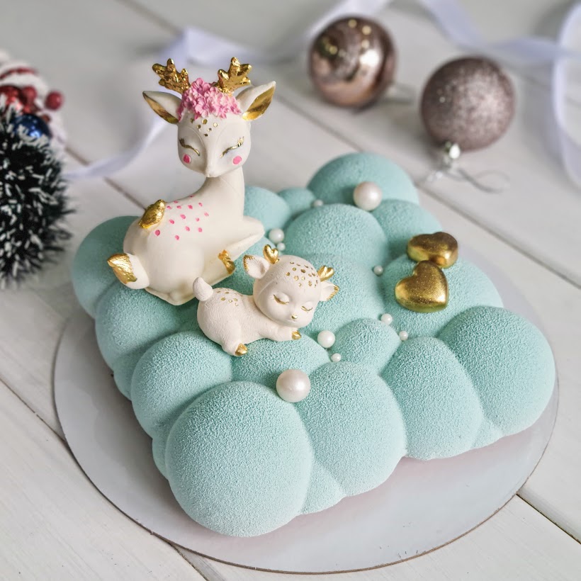 Муссовый торт в форме облака с велюровым покрытием и шоколадными фигурками оленят прекрасно дополнит праздничный стол
