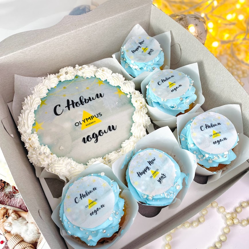 Набор бенто-торт и капкейки с кремовым оформлением и сахарной печатью логотипа компании