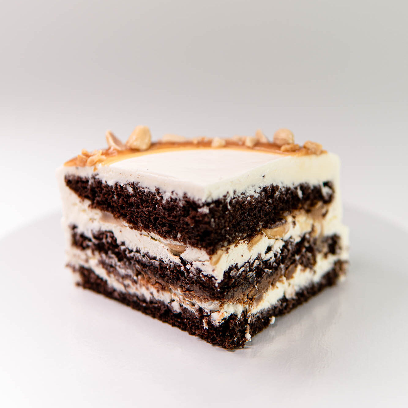 шоколадные бисквиты, пропитанные сливочно-карамельным кремом, хрустящий слой с молочным шоколадом и вафельной крошкой Роялтин, соленая карамель с арахисом